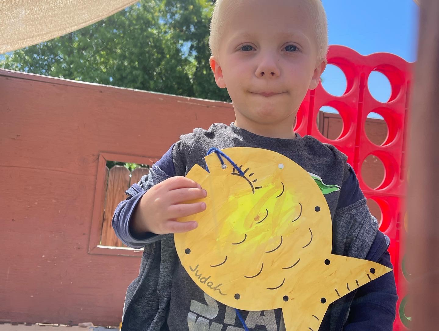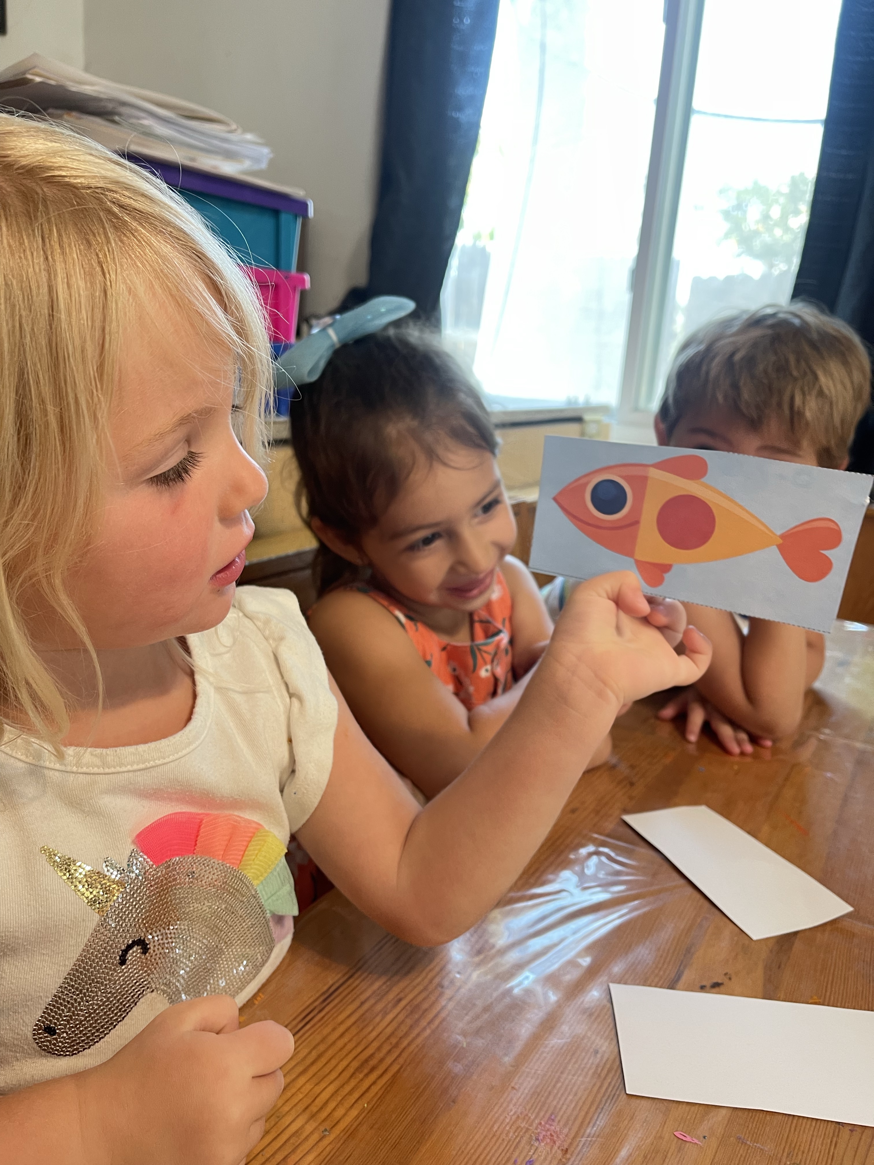 What colors are fish? We gave each child a fish shape, and we invited them to decorate and color their fish and give them a name. With this activity, we focused on our fine motor skills, visual arts, and writing. When we were done we took them out to our pirate ship and pretended to fish!