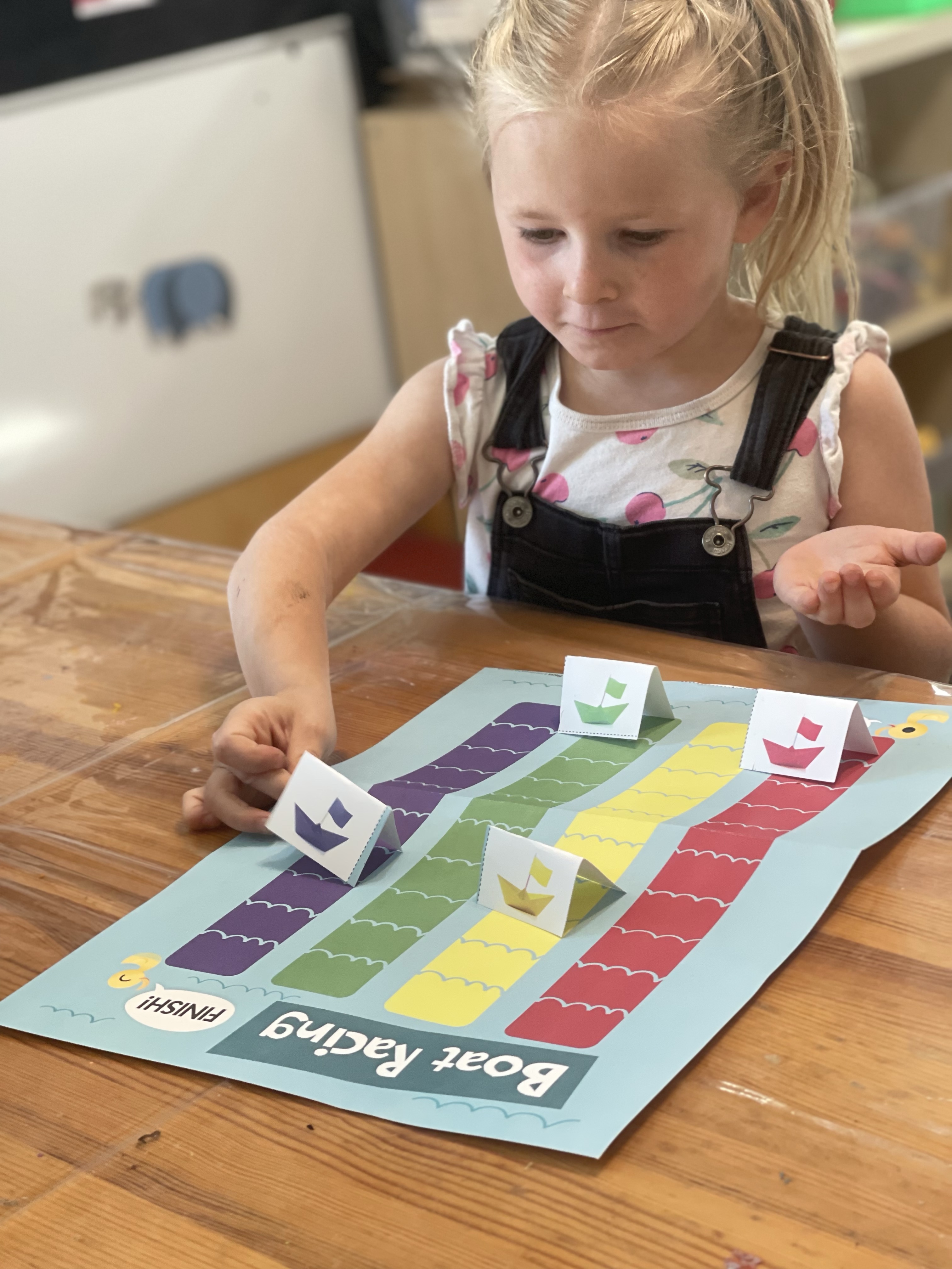 Experience Early Learning Curriculum has the best small group math games for sure. They go with our theme and are engaging to kids of all ages. We save these games and play them over and over! We helped the child count the dots on the die and then count and point to the space where his boat needs to go.
